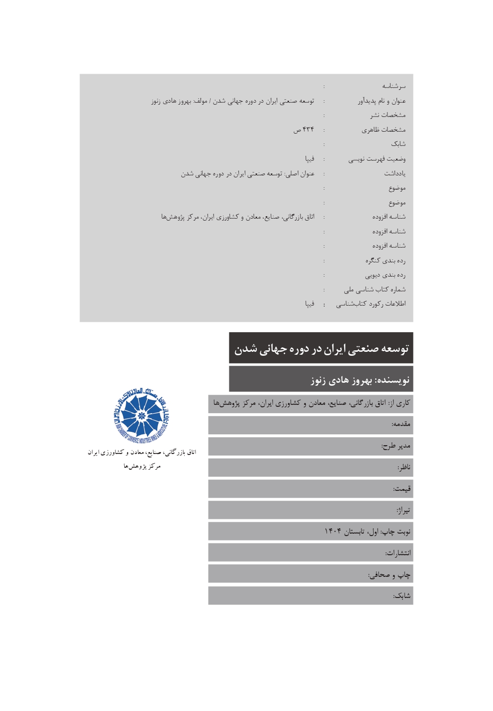 این کتاب، اثری از بهروز هادی زنوز، می باشد، که به همت مرکز پژوهش های اتاق بازرگانی ایران، در دسترس عموم قرار گرفته است.